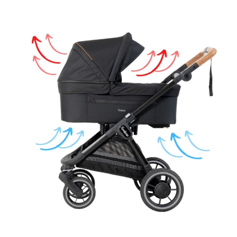 Uniquely designed to provide fresh air flow to your child. The canopy has ventilation openings and the apron can be opened for better circulation.