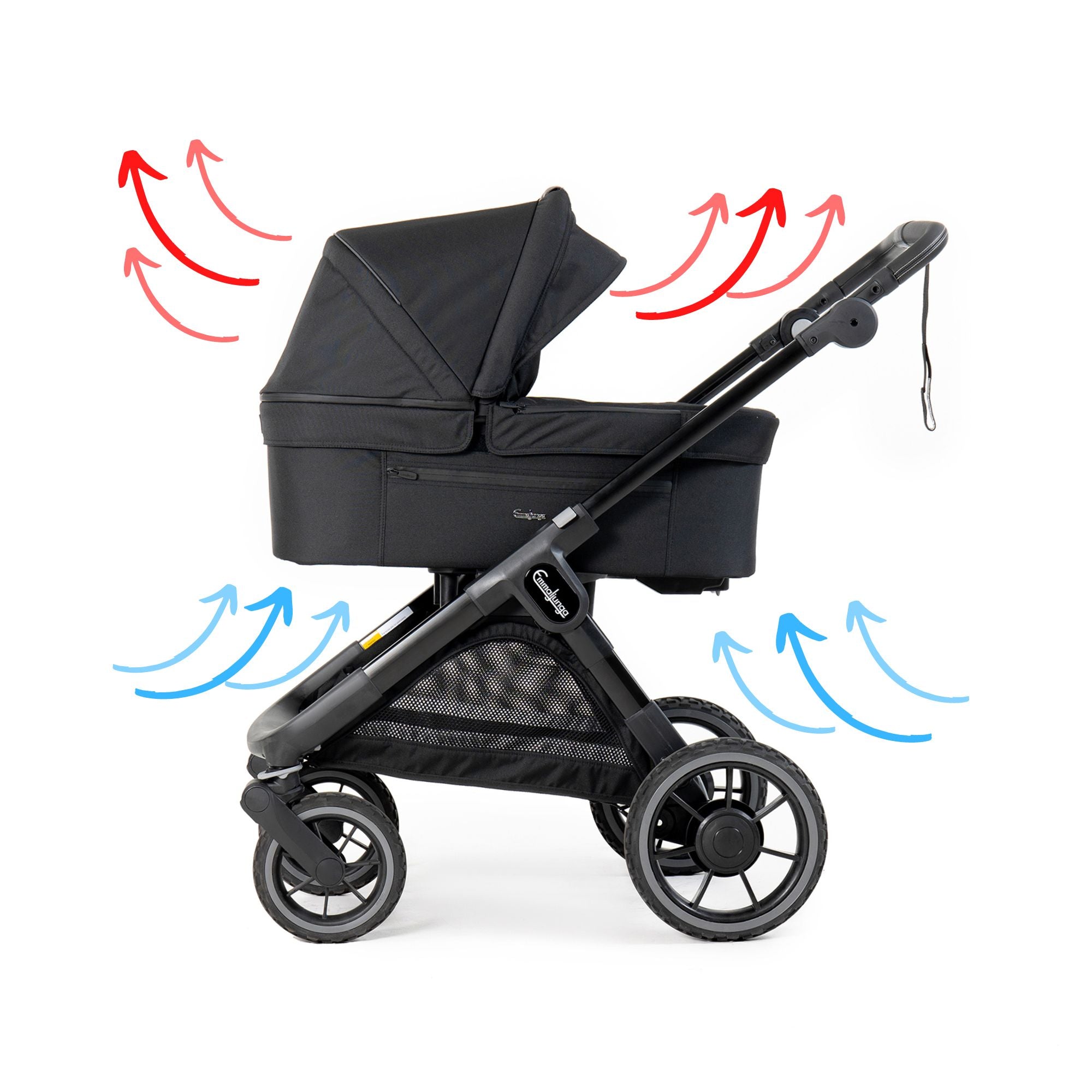 Uniquely designed to provide fresh air flow to your child. The canopy has ventilation openings and the apron can be opened for better circulation.